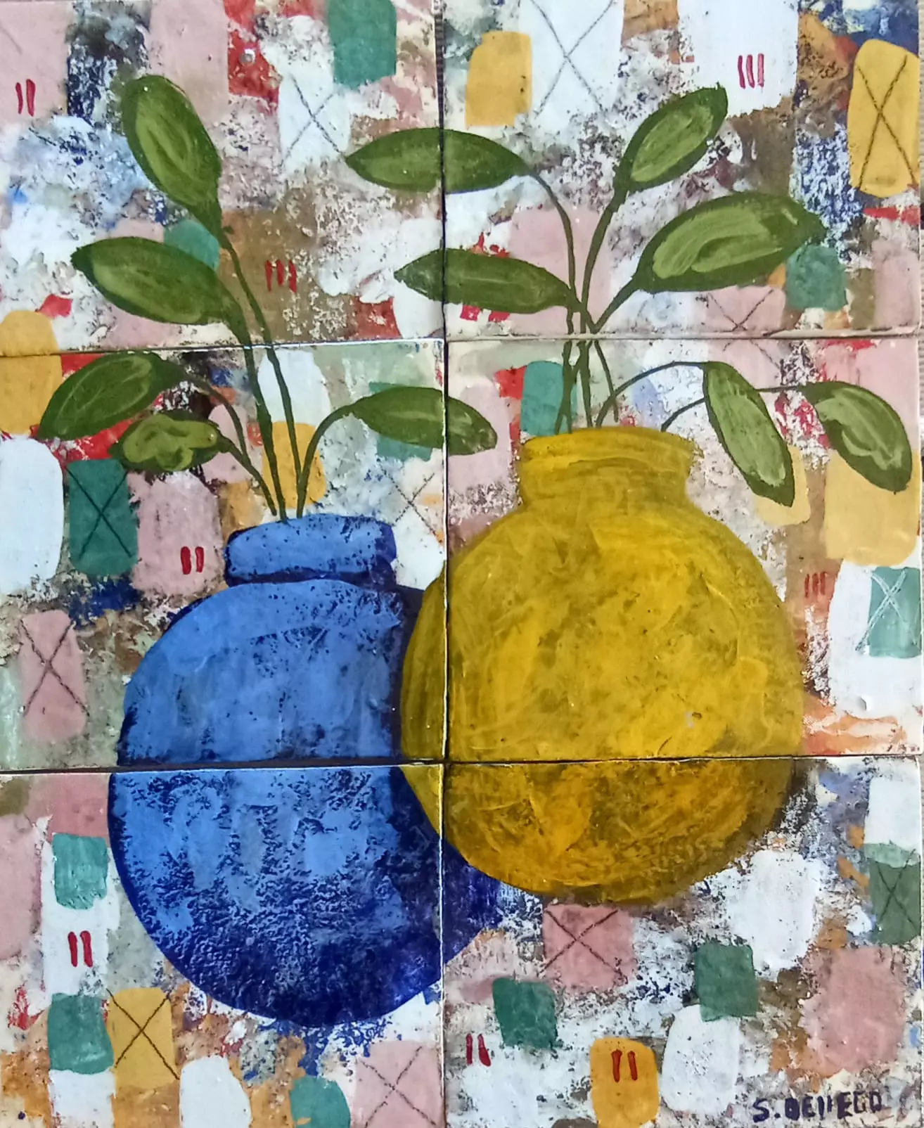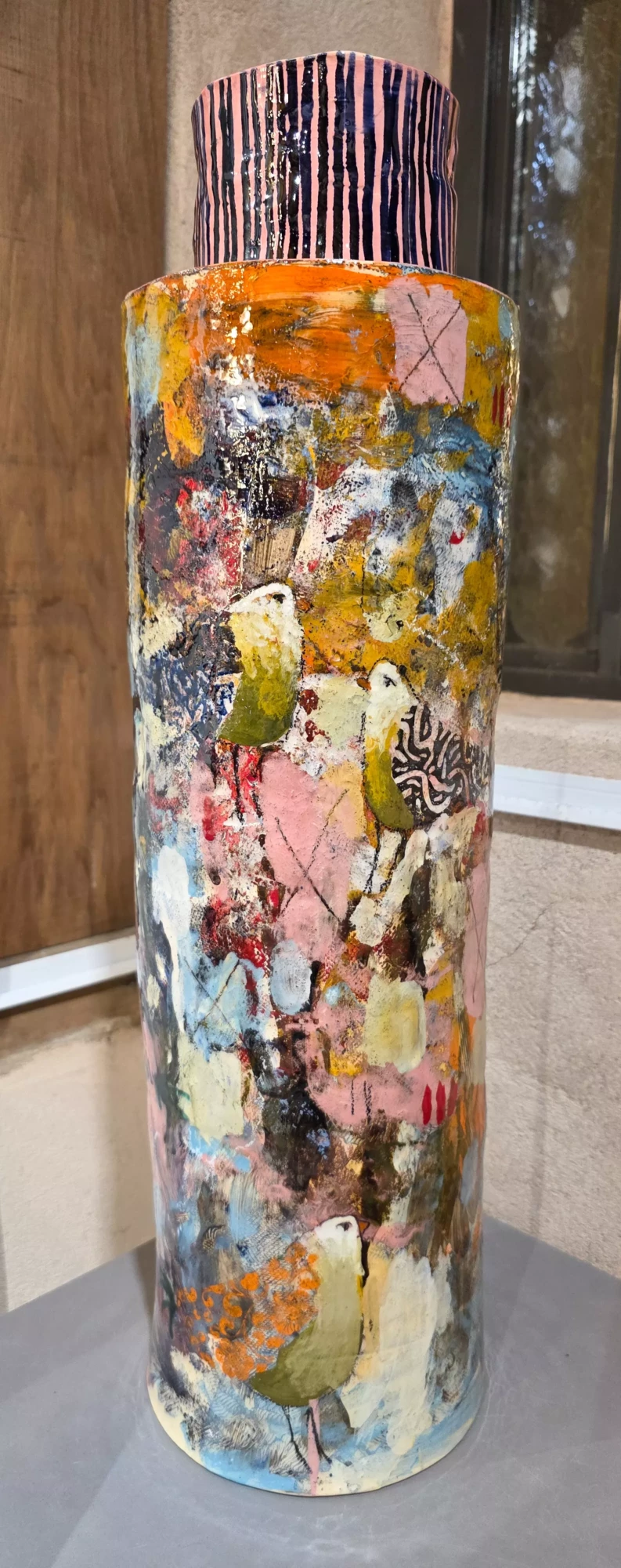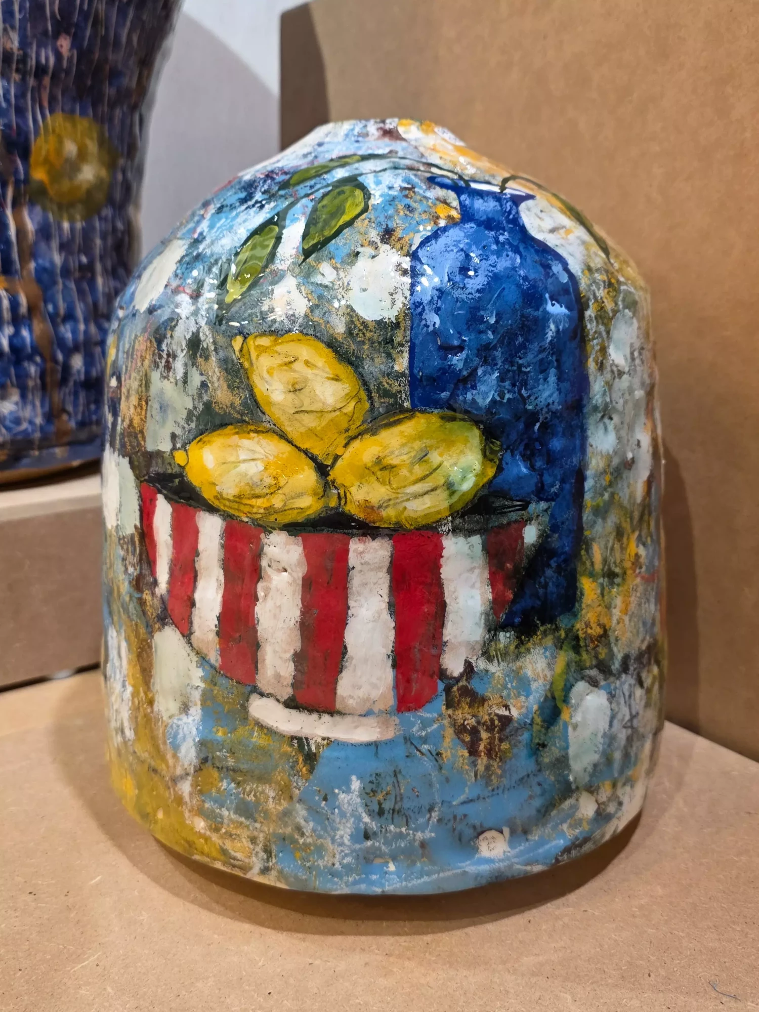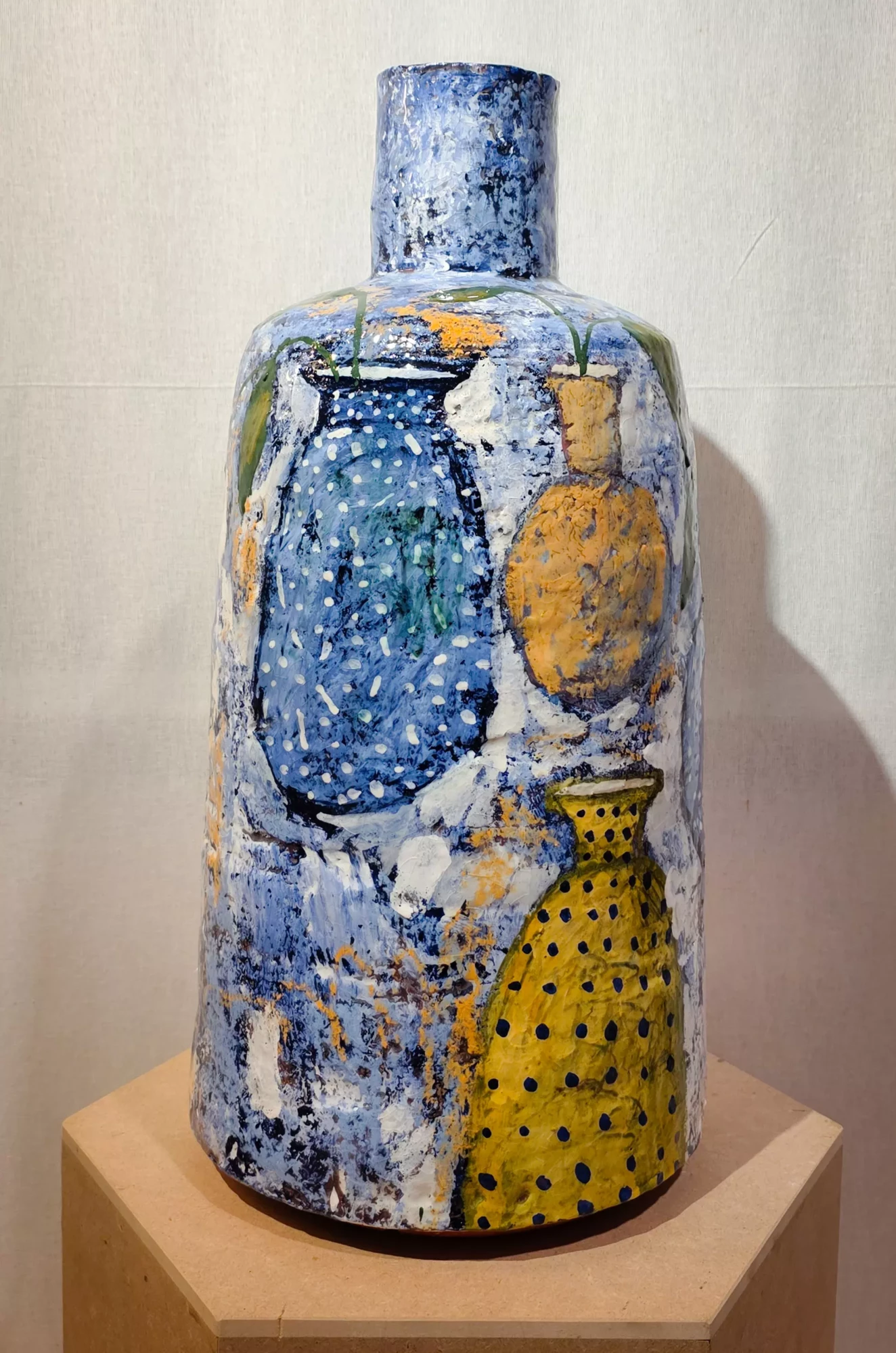 Ses créations ont pour support la faïence qu’il décor aux engobes, mais la céramique figure également dans son univers en tant que sujet de composition.