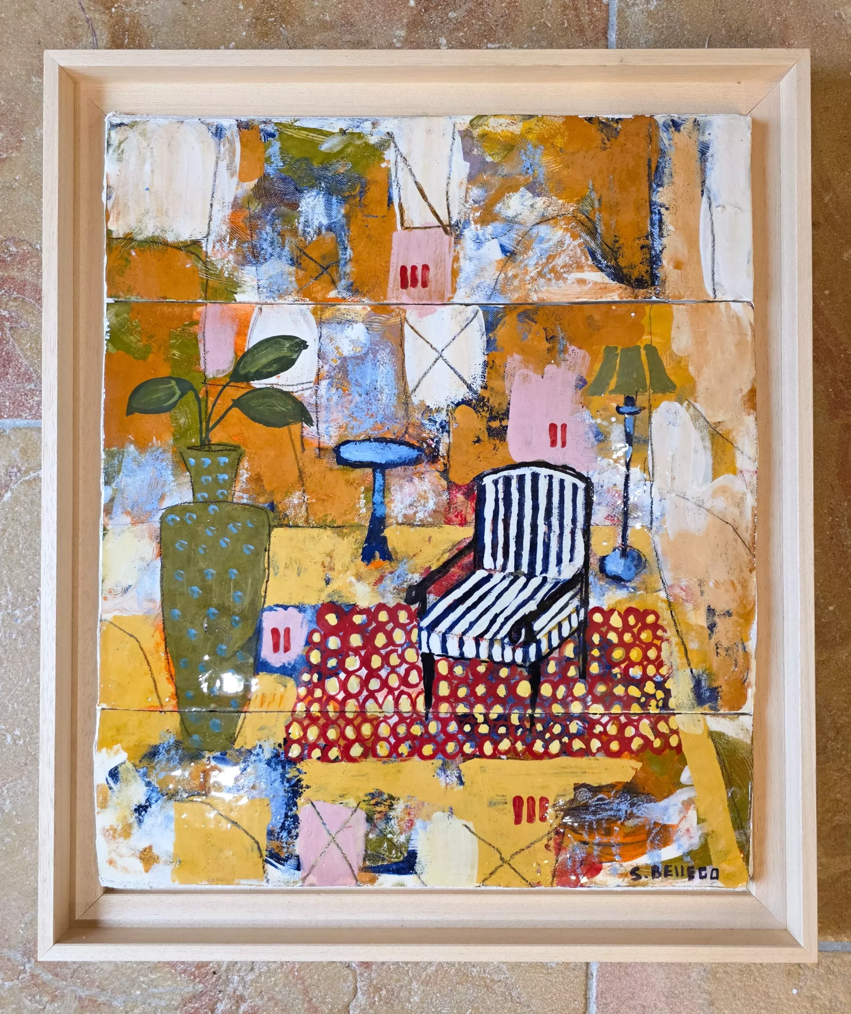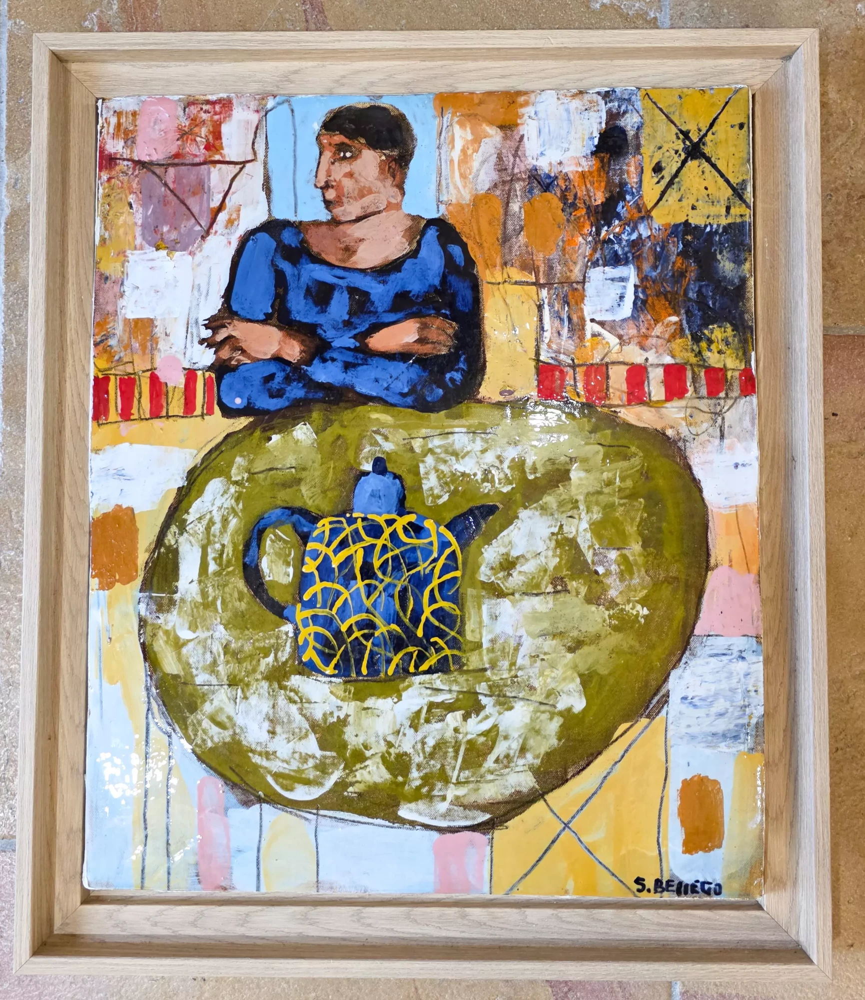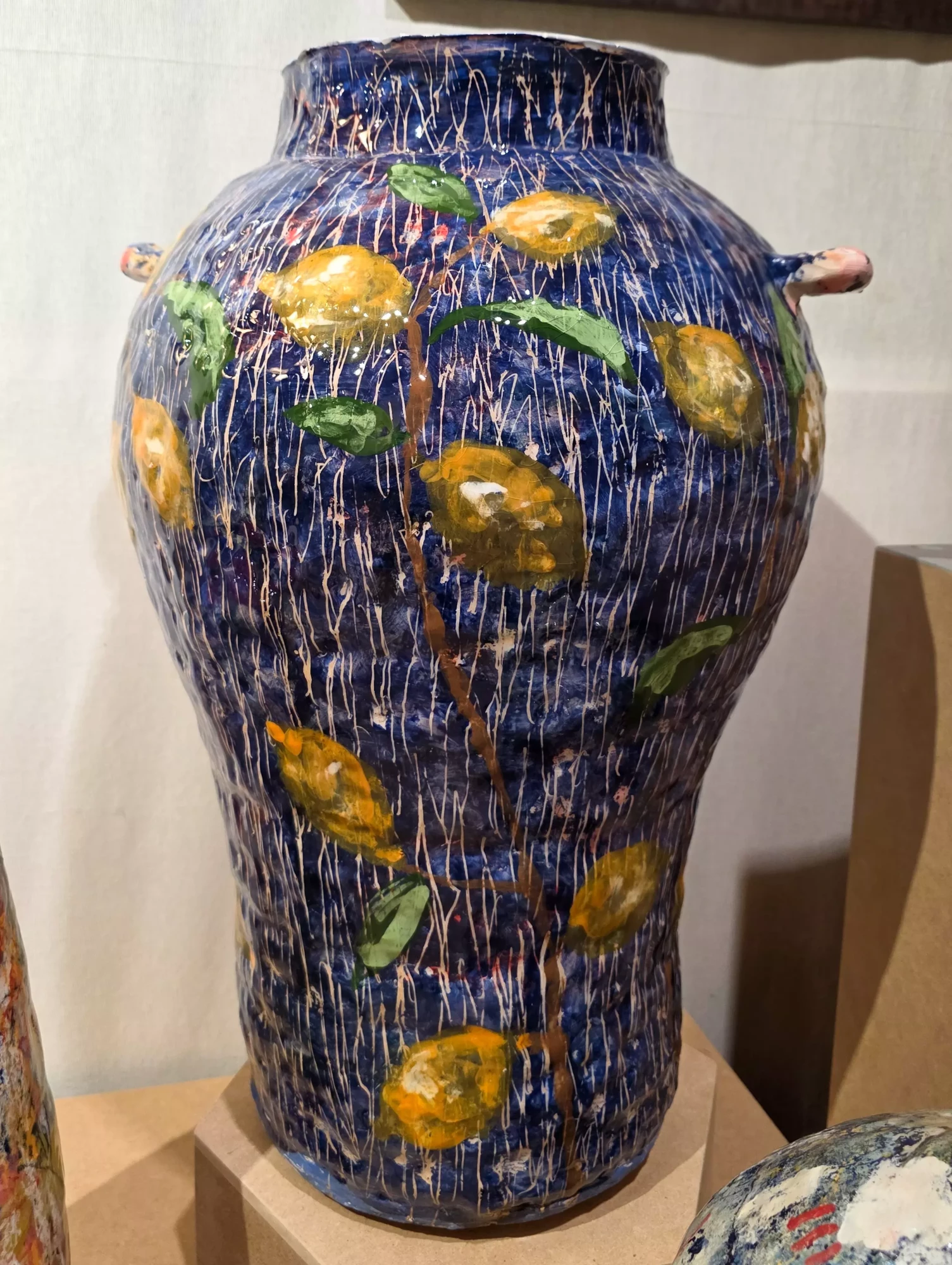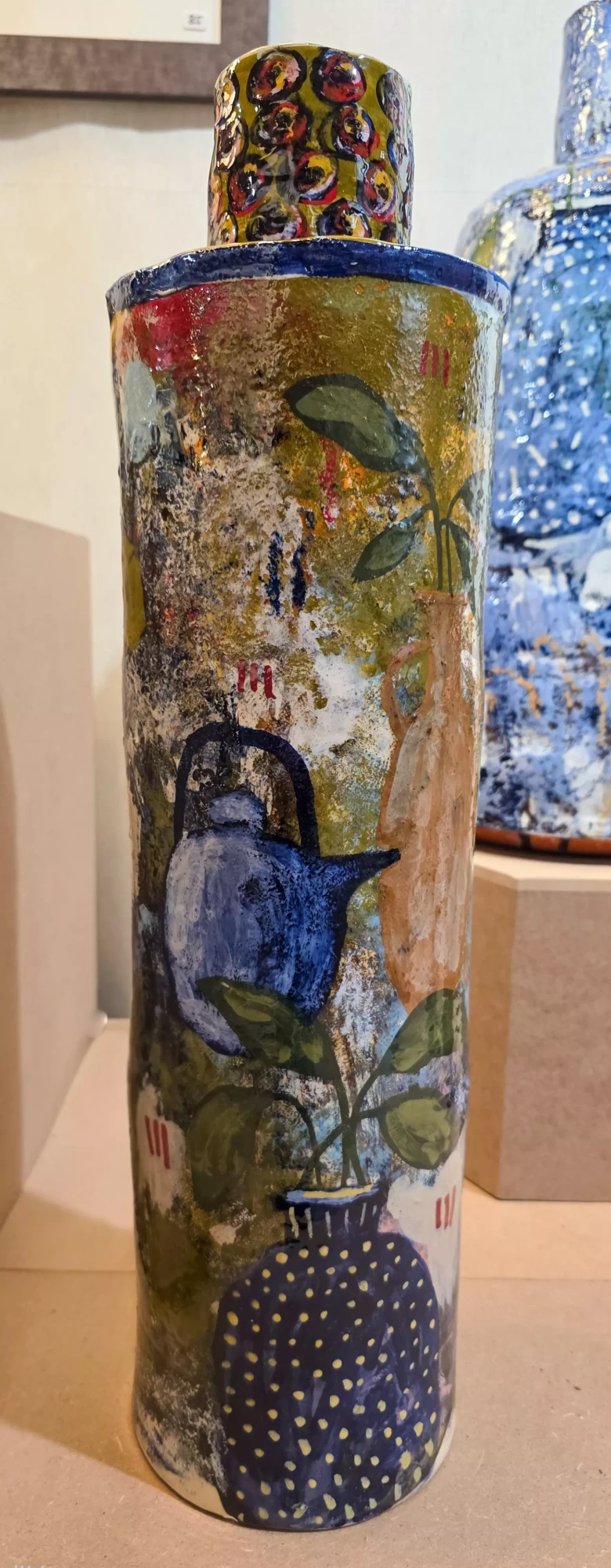 Ses créations ont pour support la faïence qu’il décor aux engobes, mais la céramique figure également dans son univers en tant que sujet de composition.