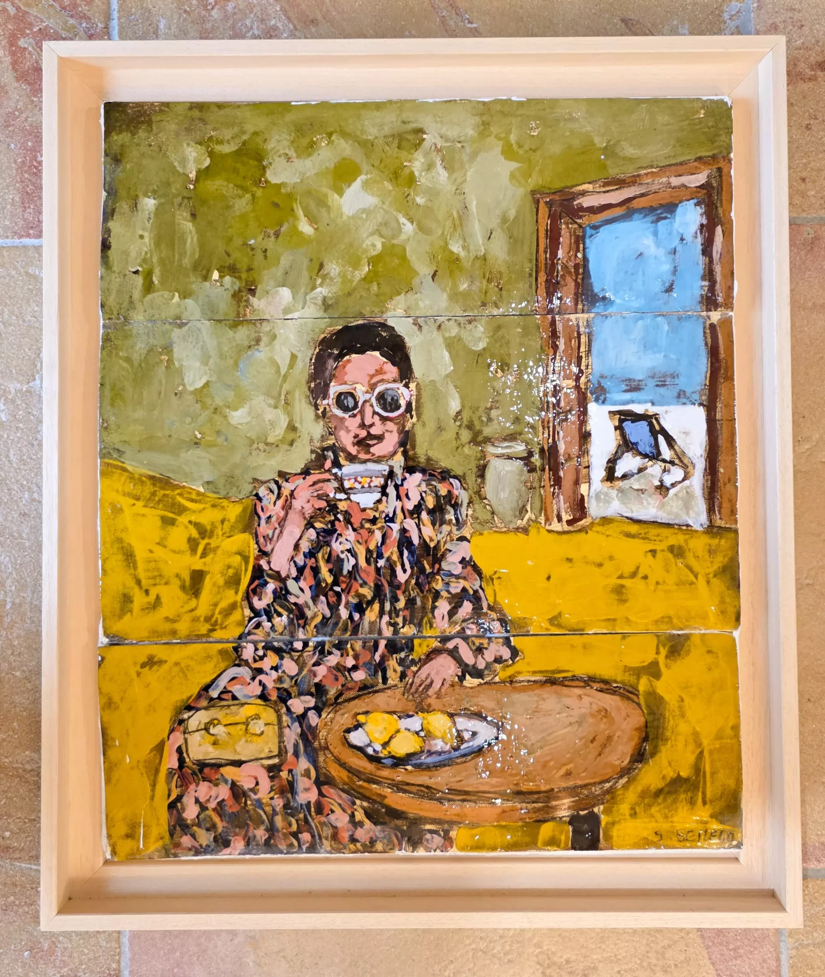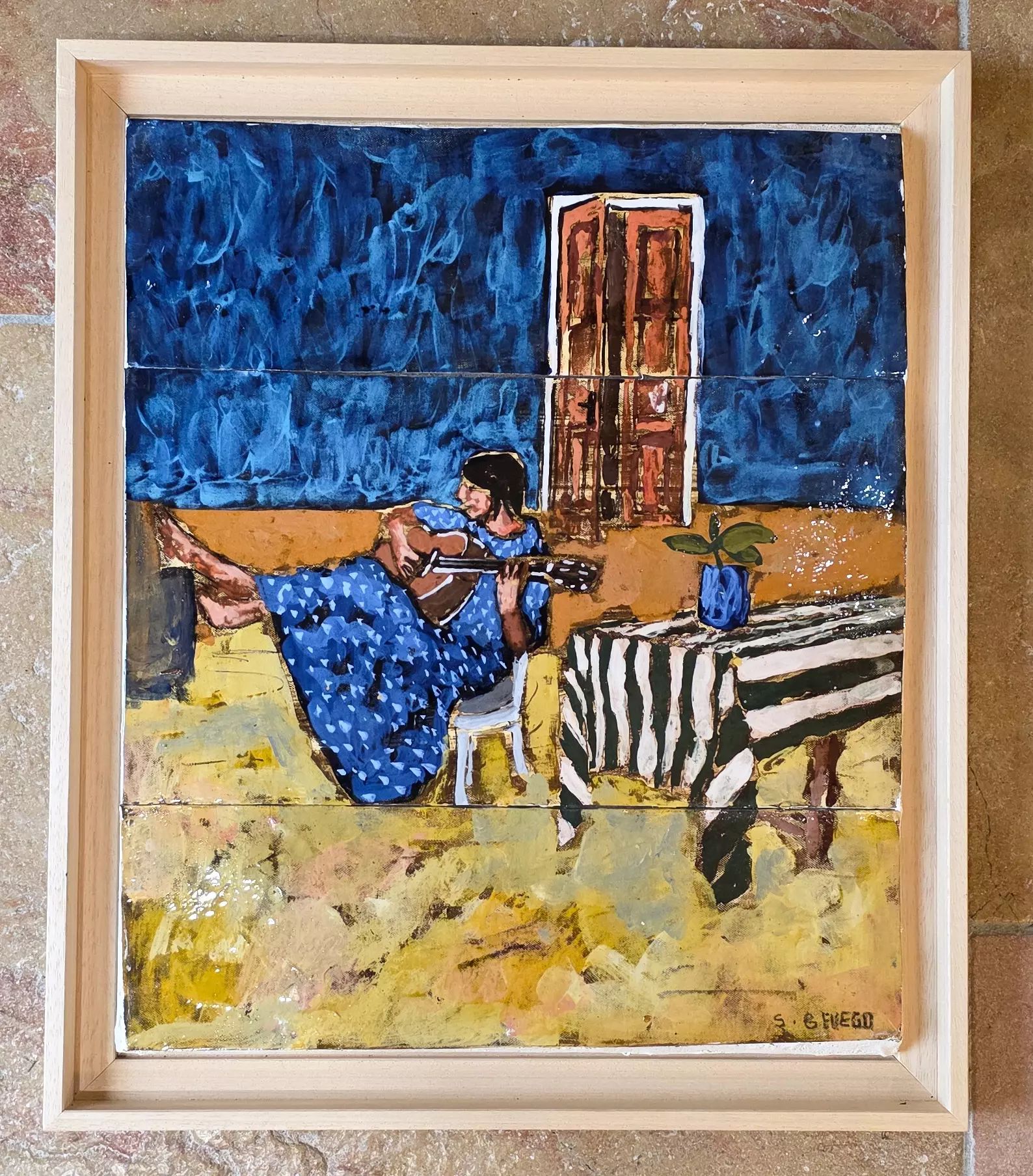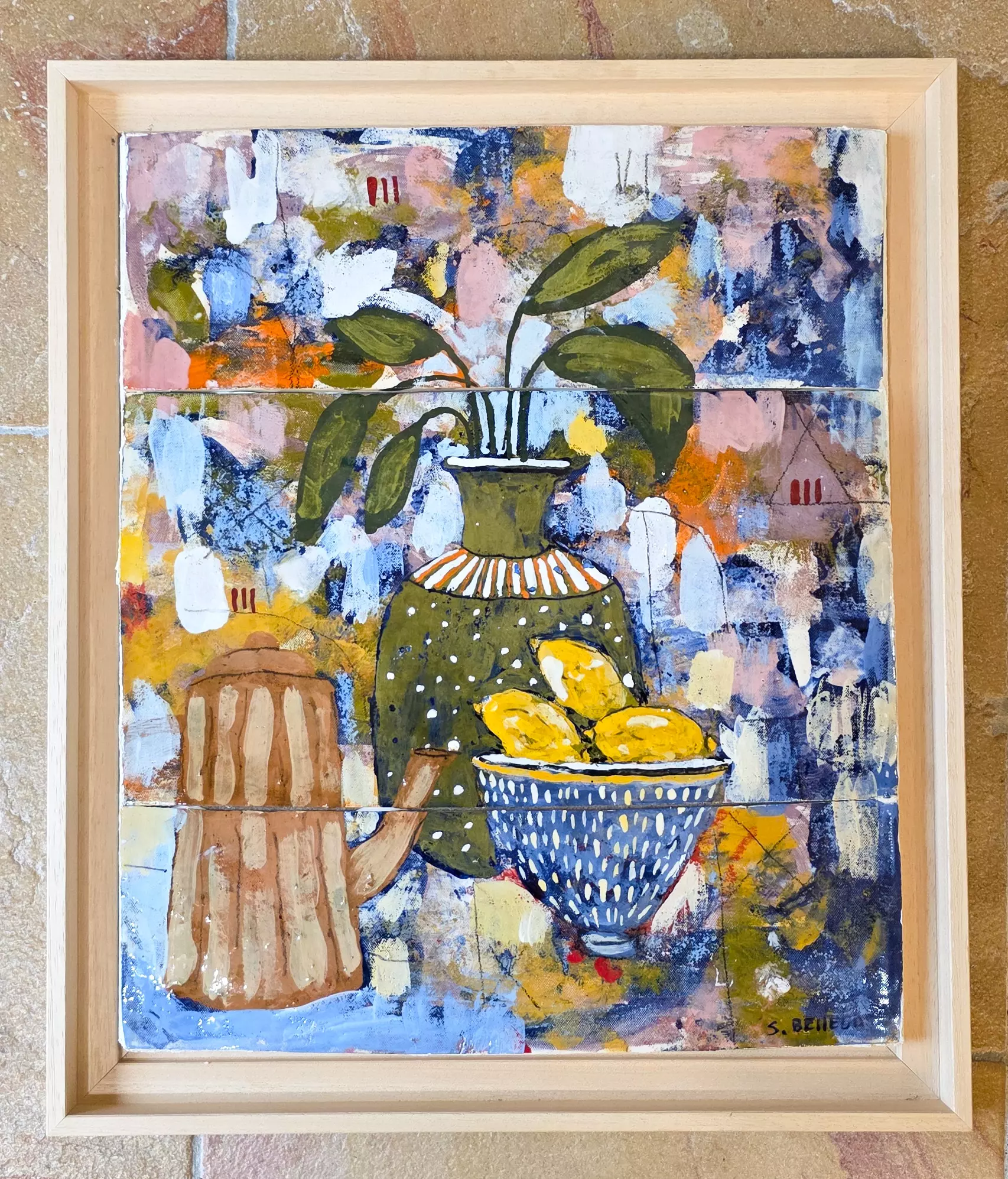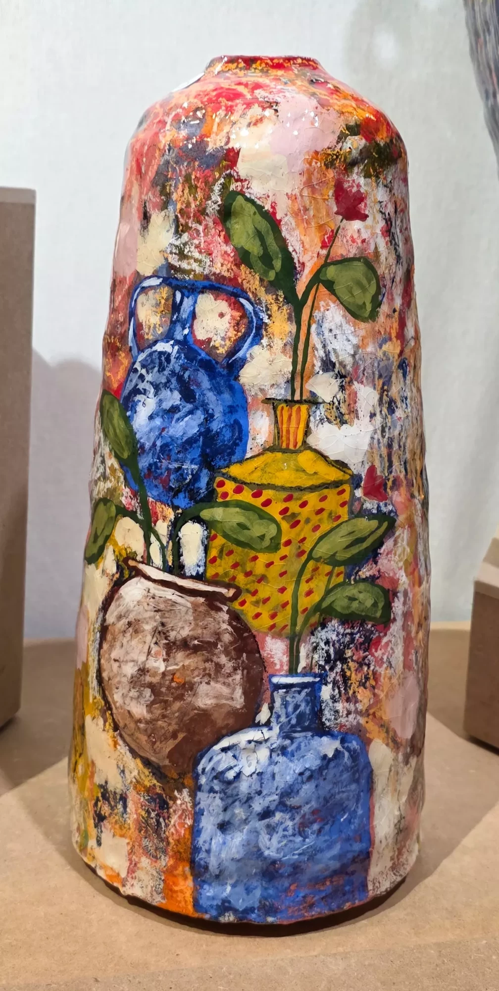 Ses créations ont pour support la faïence qu’il décor aux engobes, mais la céramique figure également dans son univers en tant que sujet de composition.